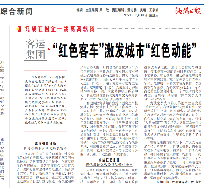 7月14日,沈陽日報以《 “紅色客車”激發(fā)城市“紅色動能”》為題報道了沈陽客運集團以黨建為引領,助推企業(yè)高質量發(fā)展之新變化。