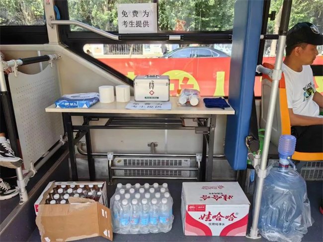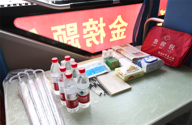 “黃河服務(wù) 千家萬戶”“助力考生 金榜題名”等醒目的祝福標(biāo)語掛滿了車身,在車廂內(nèi)準(zhǔn)備了急救包、風(fēng)油精、暈車藥、創(chuàng)可貼、口罩、礦泉水、雨傘、報紙等物品,應(yīng)有盡有,供大家隨時取用。