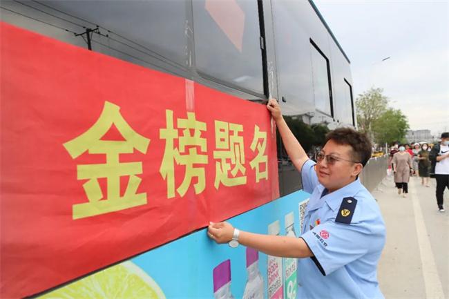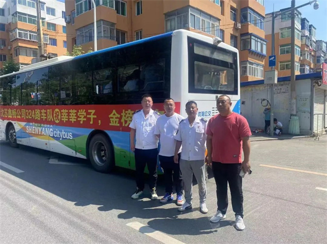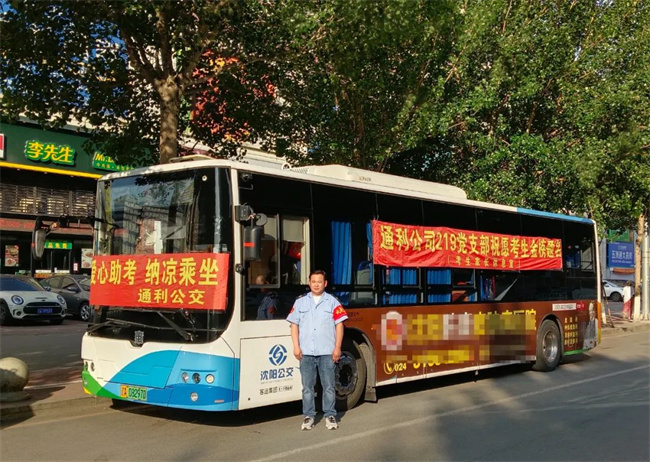 224路駕駛員王樹祥早早來到沈陽建筑大學(xué)附屬中學(xué)校門前,掛起“224車隊祝高考考生金榜題名”的橫幅,為考生加油鼓勁。