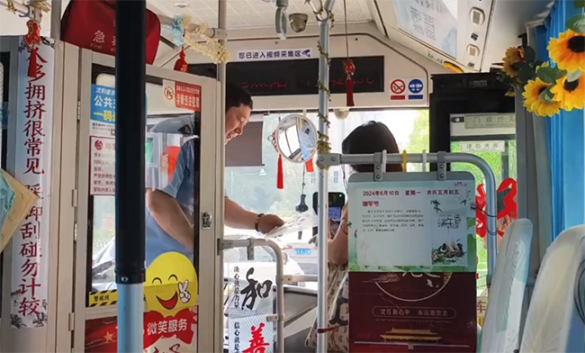 260路四星級駕駛員繆立眾早早來到工作崗位,做好出車前各項準備工作的同時,還將提前準備好的五彩繩、香包、葫蘆等寓意平安、健康的小禮物擺放在駕駛室。每到一站,他都起身微笑著向上車的乘客送上祝福,并將小禮物贈送給每一位乘客。收到祝福的乘客們充滿了驚喜和感動,紛紛豎起大拇指,對這位駕駛員的暖心舉動贊不絕口。