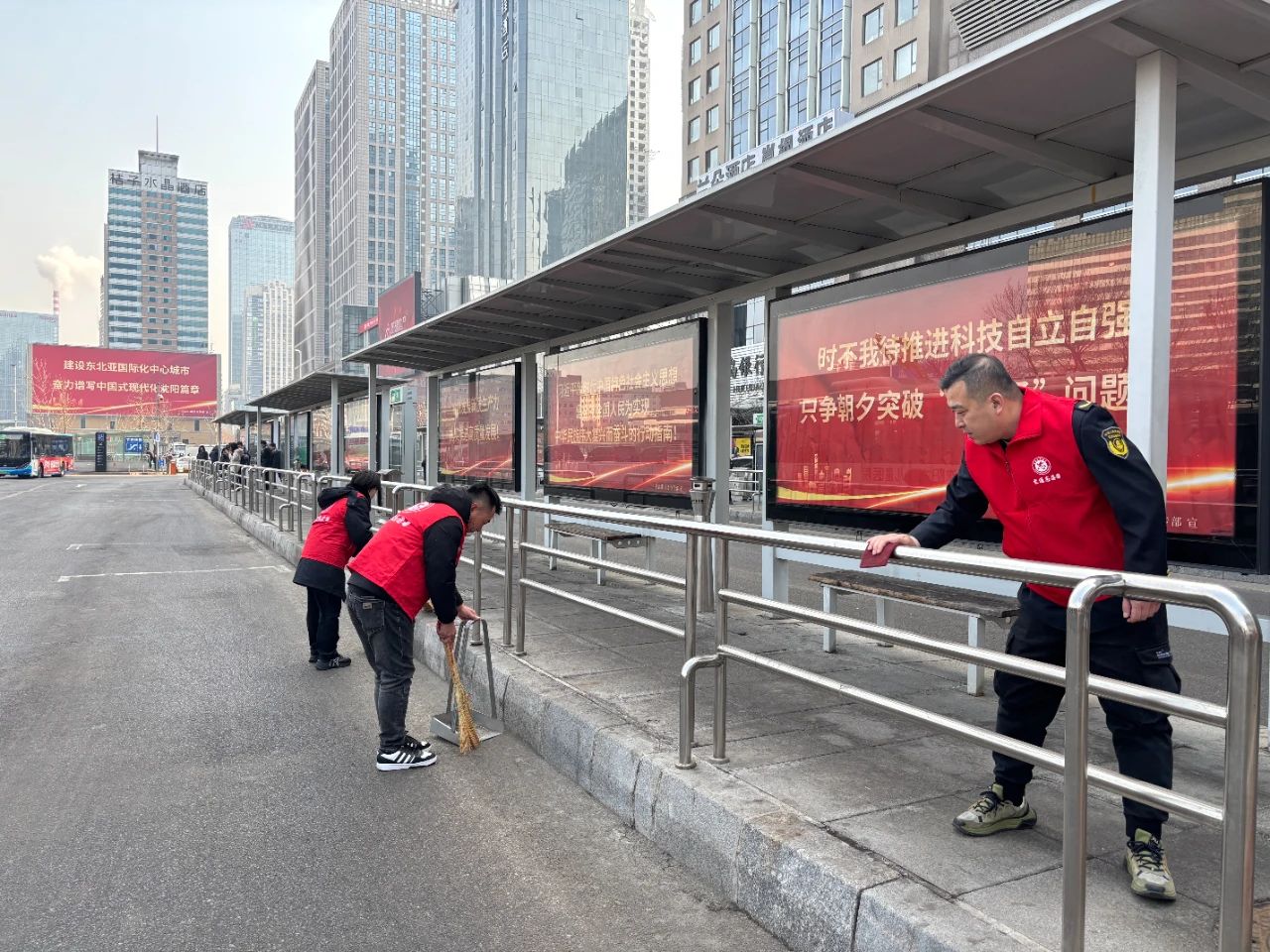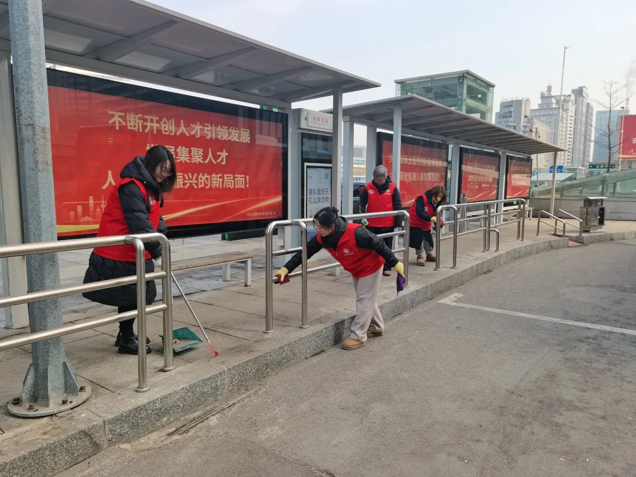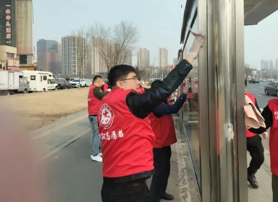 在北站公交樞紐站,志愿者們認(rèn)真清掃公交樞紐站內(nèi)的垃圾、擦拭公交候車(chē)?yán)纫约芭抨?duì)護(hù)欄,不放過(guò)任何一個(gè)衛(wèi)生死角,為乘客們營(yíng)造了一個(gè)整潔舒適的候車(chē)環(huán)境。