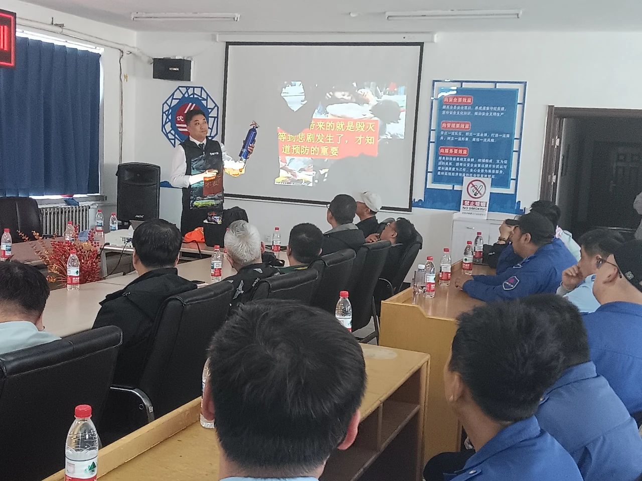 隨后,王殿陽主任通過投影將一例例觸目驚心的火災案例呈現(xiàn)給在座的每一位職工,內(nèi)容涵蓋了企業(yè)安全生產(chǎn)及日常生活中常見的安全隱患排查等方面的知識,為安全防范敲響了警鐘。針對不同火情,王主任還為大家講解了如何正確使用各類滅火器,以提高自防自救能力,有效控制熄滅初期火情。