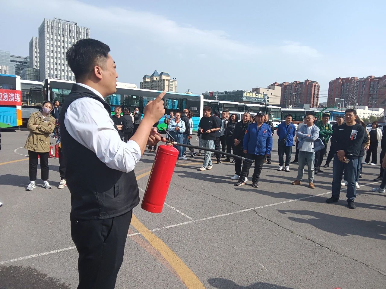 室外環(huán)節(jié),車隊管理人員和駕駛員現(xiàn)場學習了在公交車輛突發(fā)事件中,駕駛員如何采取應急措施,疏散乘客到安全位置,以及如何正確使用滅火器進行滅火,最大限度保障人民生命財產(chǎn)安全。