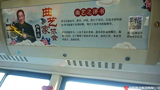 為進(jìn)一步豐富藝術(shù)惠民的內(nèi)容,滿足廣大乘客日益多樣化的藝術(shù)需求,擴(kuò)大“藝術(shù)公交”的影響力,惠及更多的乘客,和平區(qū)文聯(lián)、沈陽(yáng)客運(yùn)集團(tuán)有限公司、沈陽(yáng)藝海星辰科技有限公司又聯(lián)合推出了“文學(xué)專(zhuān)號(hào)”、“曲藝專(zhuān)號(hào)”、“國(guó)學(xué)專(zhuān)號(hào)”三輛藝術(shù)公交車(chē)。藝術(shù)公交車(chē)已成為聯(lián)系和溝通藝術(shù)家與乘客的紐帶和橋梁,互動(dòng)雙贏,既激發(fā)了藝術(shù)家的創(chuàng)作靈感和熱情,又提升了乘客的藝術(shù)品味和鑒賞力。