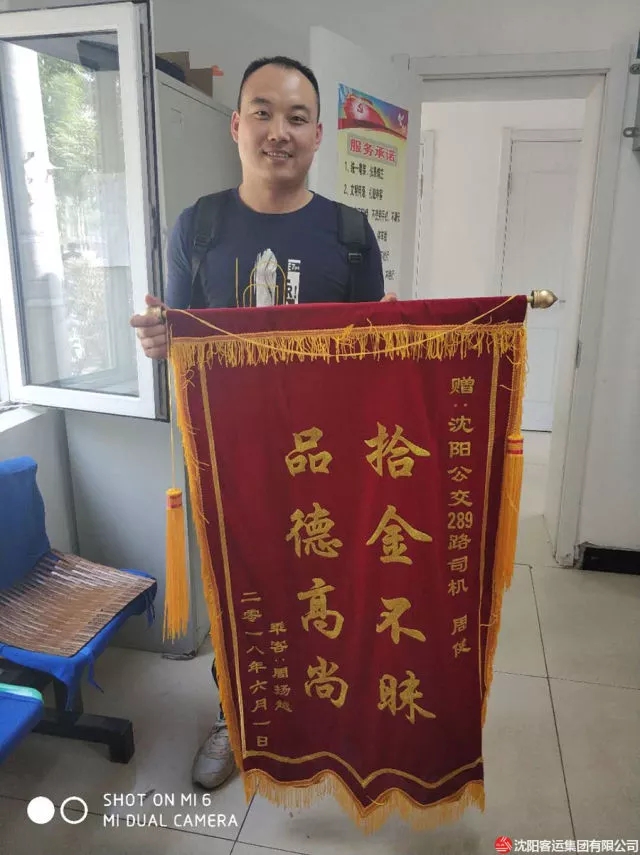 2018年6月2日上午,通利公司289路車隊(duì)辦公室來了一名男乘客,手拿錦旗滿臉笑容的找到車隊(duì)殷隊(duì)長,感謝車隊(duì)幫忙找回重要的失物,使物品完好無損,現(xiàn)金、證件等無一損失,感謝拾金不昧的90后289路駕駛員周健。